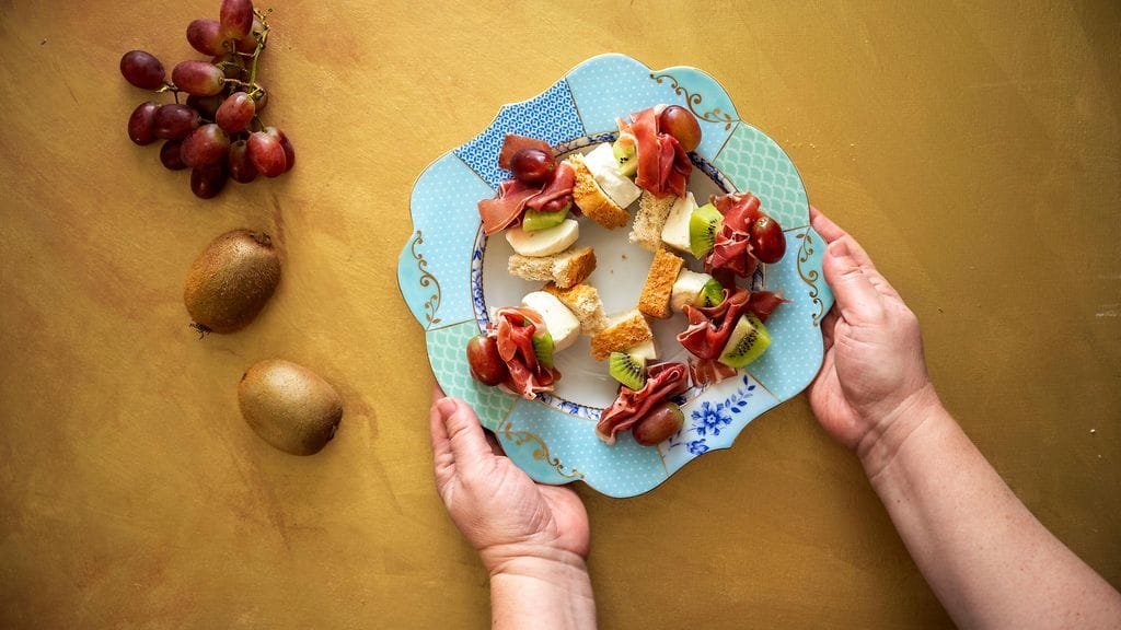 Ota esille Serrano kinkkuviipaleet ja huuhtele viinirypäleet.