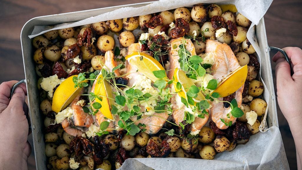 - Leikkaa sitruuna lohkoiksi ja nosta kalapalojen päälle. Murenna pinnalle fetajuustoa. Laita aurinkokuivatut kirsikkatomaatit perunoiden joukkoon ja laita päälle vielä muutama oksa oreganoa.