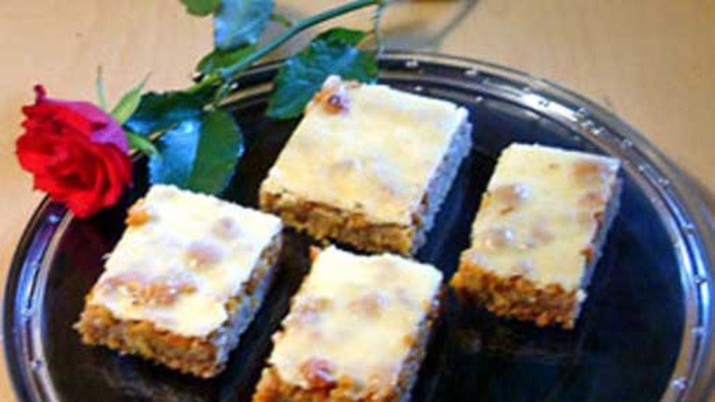 Vaahdota huoneen lämpöinen rasva ja sokeri, lisää munat yksitellen. Lisää vaahtoon jauhot varovasti. Levitä taikina leivinpaperin päälle uunipellille. Paista pohjaa n. 13 min 200 asteisessa uunissa. Levitä hillat tasaisesti esipaistetulle pohjalle ja kaada päälle keskenään sekoitetut täytteen muut aineet. Paista vielä n. 15 min. Anna jäähtyä kunnolla ennen leikkausta. Piirakka sopii hyvin myös pakastettavaksi.