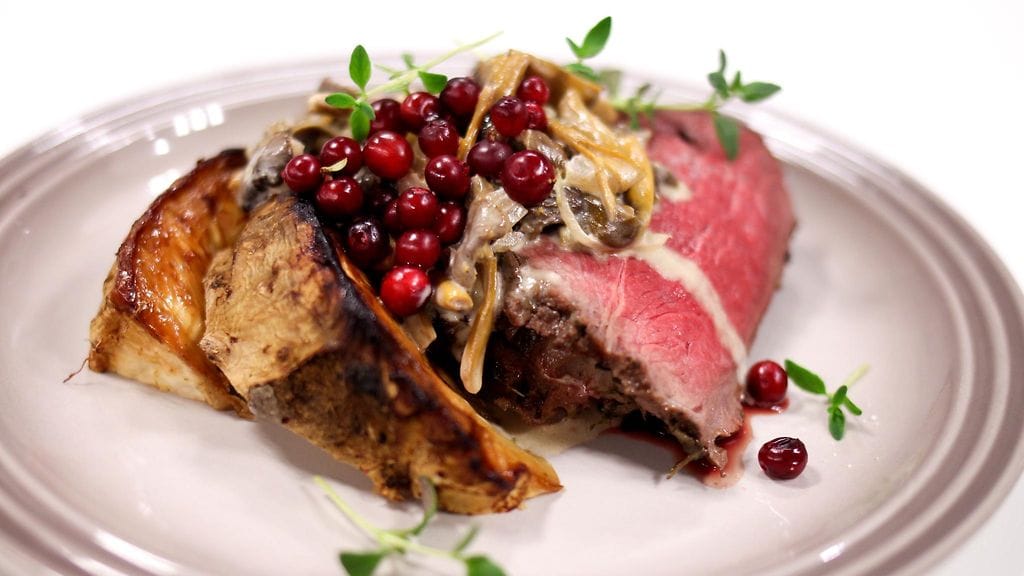 Laita paisti ja kokonaiset juurisellerit 150-asteiseen uuniin. Ota paisti pois kun sisälämpö on noin 56 astetta (riippuen toivotusta kypsyysasteesta). Kääri paisti folioon ja anna vetäytyä noin 30 minuuttia ennen leikkaamista. Jätä juurisellerit paahtumaan uuniin vielä noin 30 minuutiksi, nosta lämpö 200-asteeseen. Ota sellerit pois uunista kun on paistin leikkuun aika.