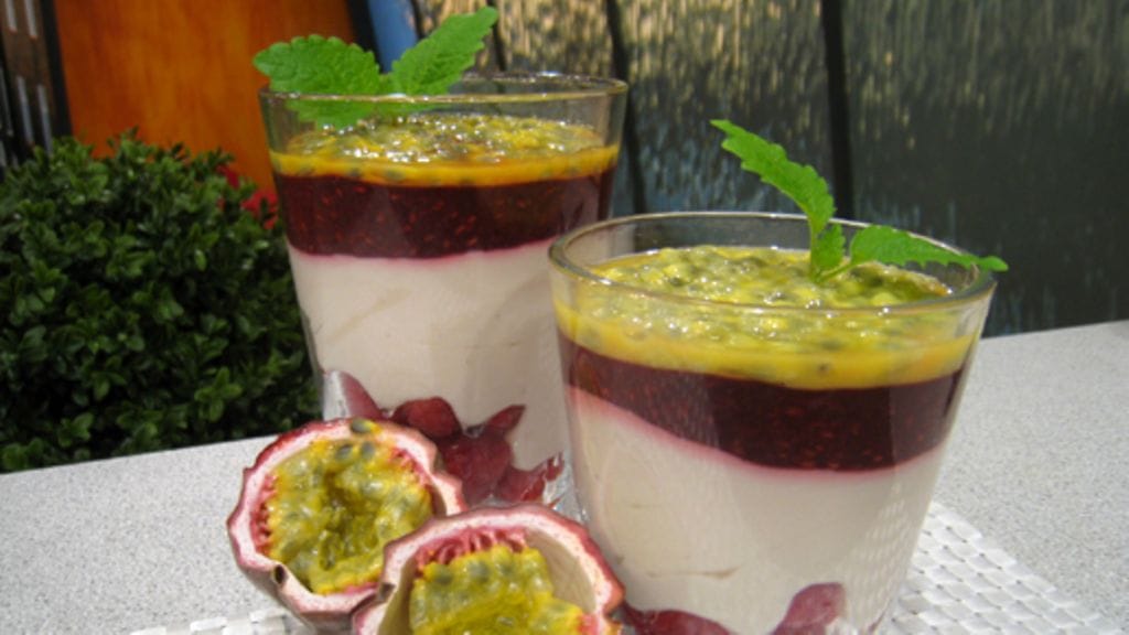 Anna hyytyä vähintään kolme tuntia jääkaapissa. Koristele passiohedelmän sisuksella.