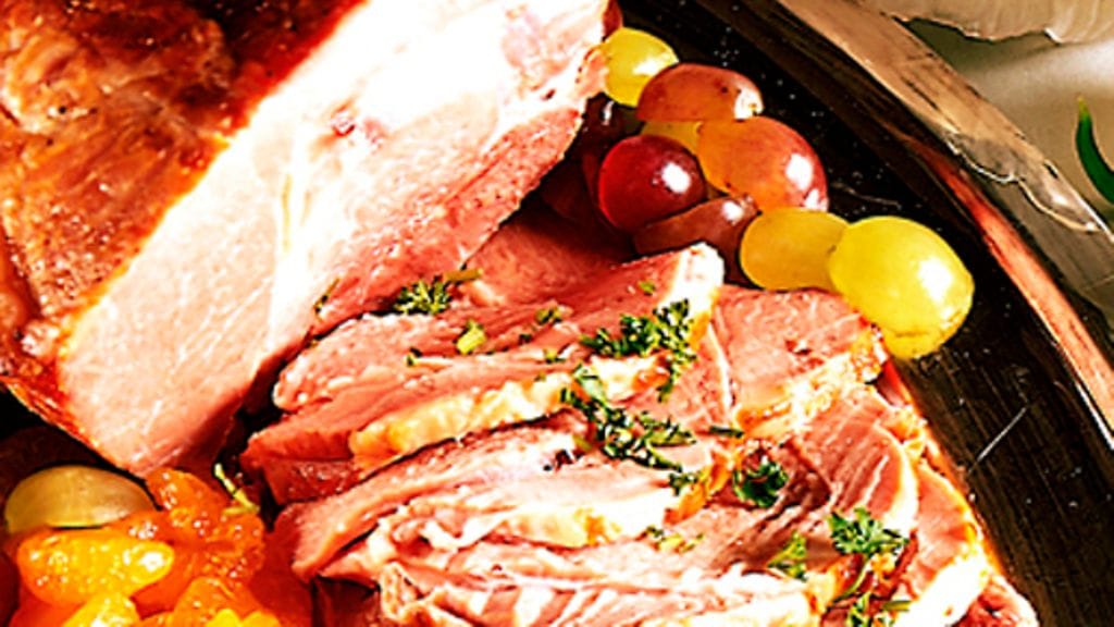 2. Paista kinkkua, kunnes mittari näyttää 75 astetta. Penslaa 15 minuutin välein omenamehu-mausteliemellä. Penslaa sen jälkeen hunajalla pari kertaa, kun lihamittari on ohittanut 70 astetta. Ripota kerran kinkun päälle paprikajauhetta. Ota kinkku uunista ja anna jäähtyä täysin.
