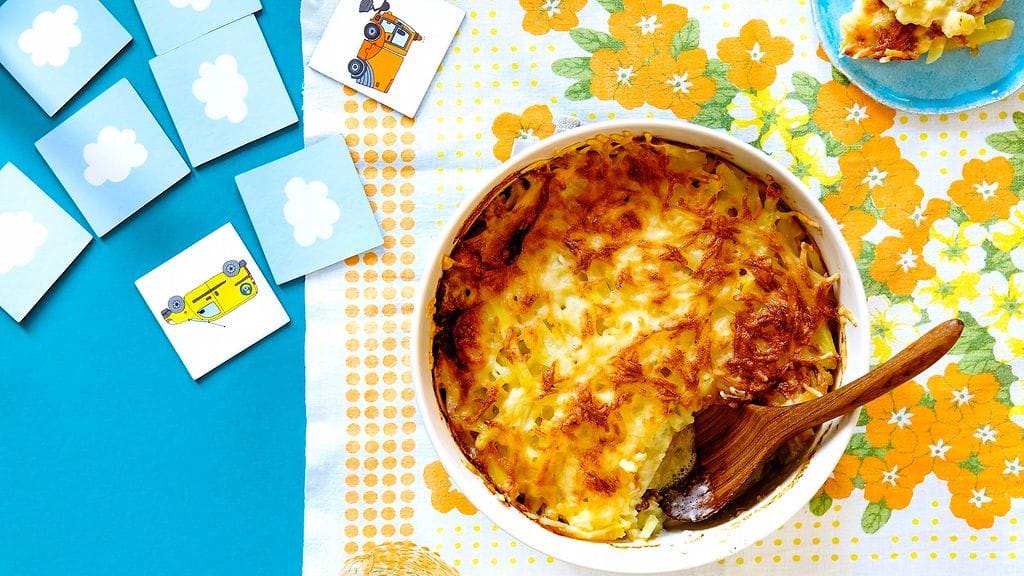 - Lisää kalasäilyke ja loppu peruna-sipulisekoitus ja mausta sekin. Levitä juustoraaste laatikon päälle ja kippaa mukaan kerma.