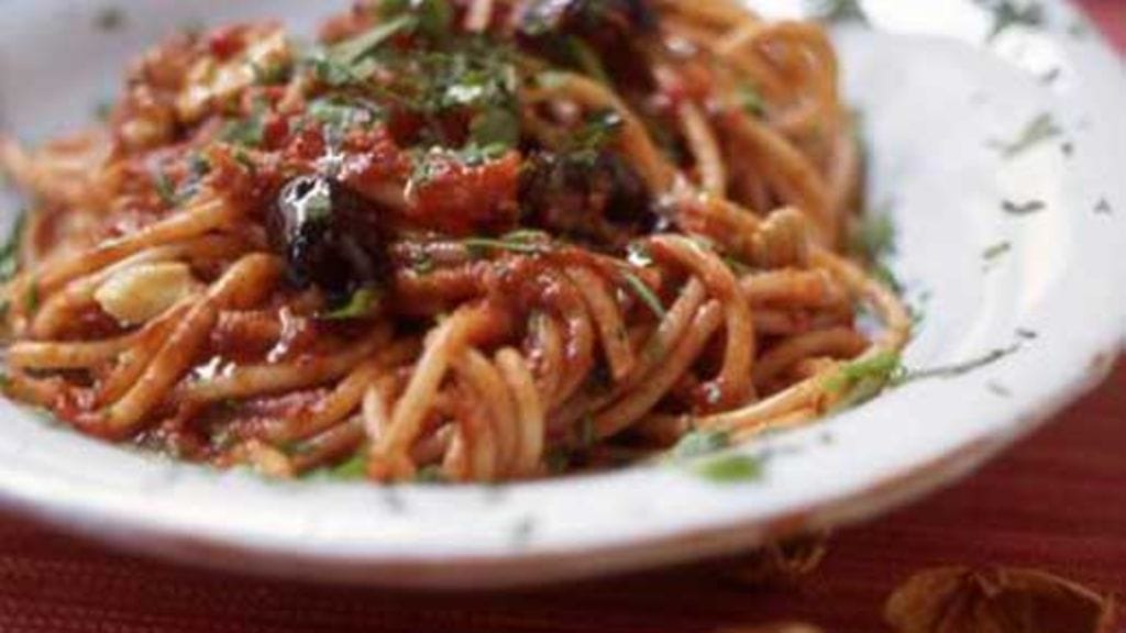 - Lämmitä oliiviöljyä isossa kastikepannussa. Lisää valkosipuli ja chilipippurit. Kun valkosipuli on kultaista lisää anjovikset, oliivit, kaprikset ja pähkinät.