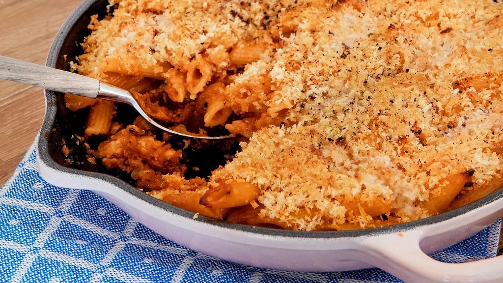 Kuumenna uuni grillivastuksella 200 asteeseen. Yhdistä pasta ja kastike, kippaa uuninkestävään pannuun ja kuorruta pankojauhojen ja parmesaanin sekoituksella ripottelemalla ne pastan päälle. Lisää pinnalle muutama voinokare ja nosta pannu uuniin.Tarkkaile, ettei pinta pääse palamaan. Muutaman minuutin päästä voit nostaa uunista valmiin pastan.