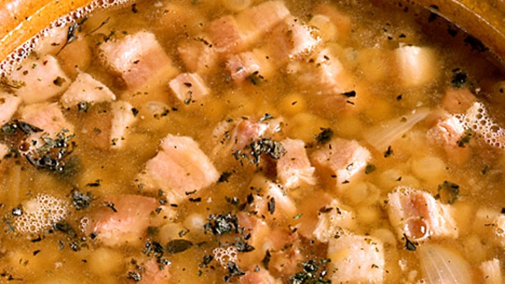 2. Laita lihakuutiot ja herneet suureen kattilaan. Lisää muut ainekset paitsi meirami ja keitä hiljalleen kunnes herneet ovat pehmenneet, 1-1 ½ tuntia. Lisää meirami loppua kohti.