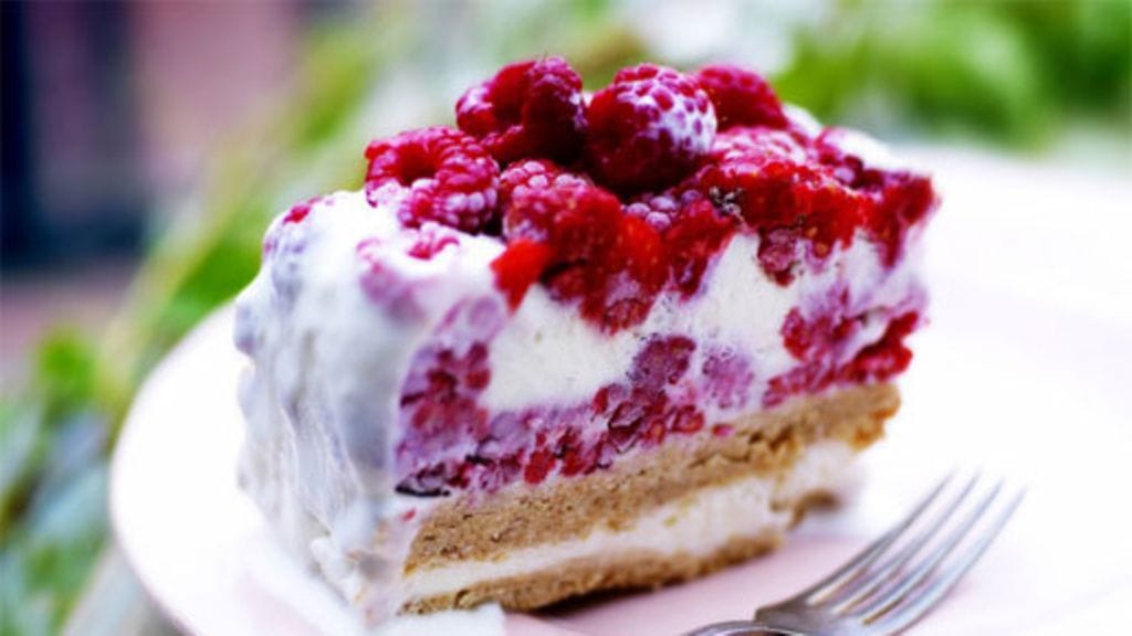 Levitä päälle loput jäätelöstä ja asettele pinnalle loput vadelmat. Peitä huolella ja jäädytä pakkasessa vähintään 4 tunnin ajan tai mieluiten yön yli.