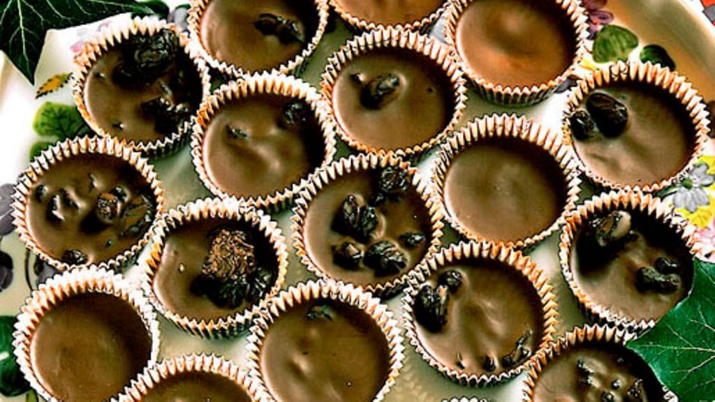 2. Lisää rusinat, pähkinät ja appelsiininkuori, sekoita ja lusikoi paperivuokiin. Laita jääkaappiin.