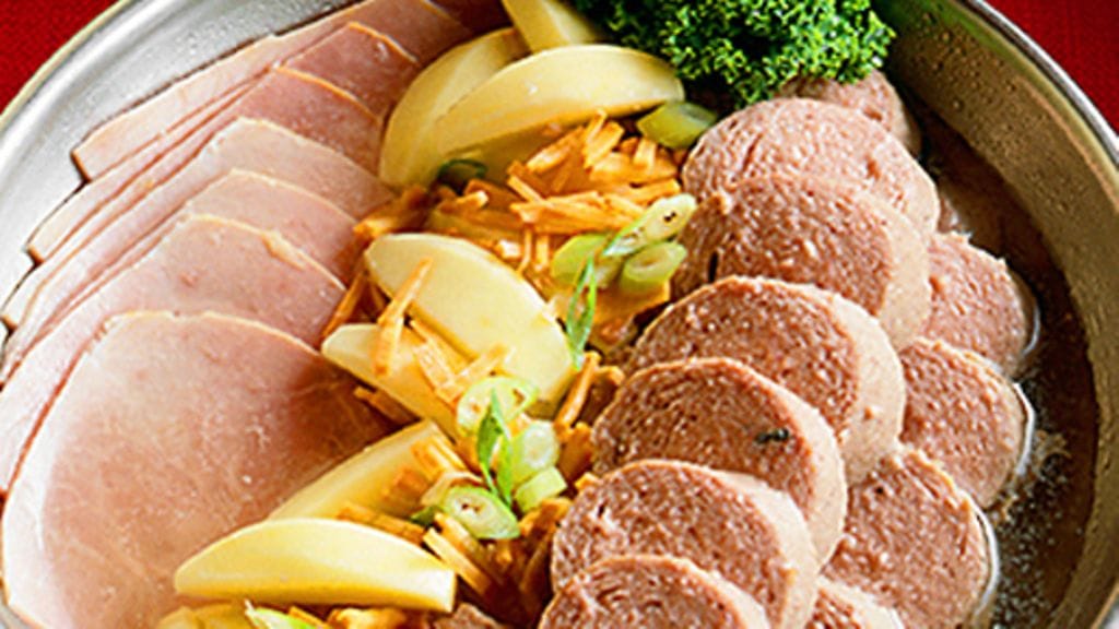 1. Kiehauta kinkunliemi paistokasarissa. Ryhmittele kinkku- ja makkaraviipaleet kasariin, alenna lämpöä ja anna kaiken lämmetä.