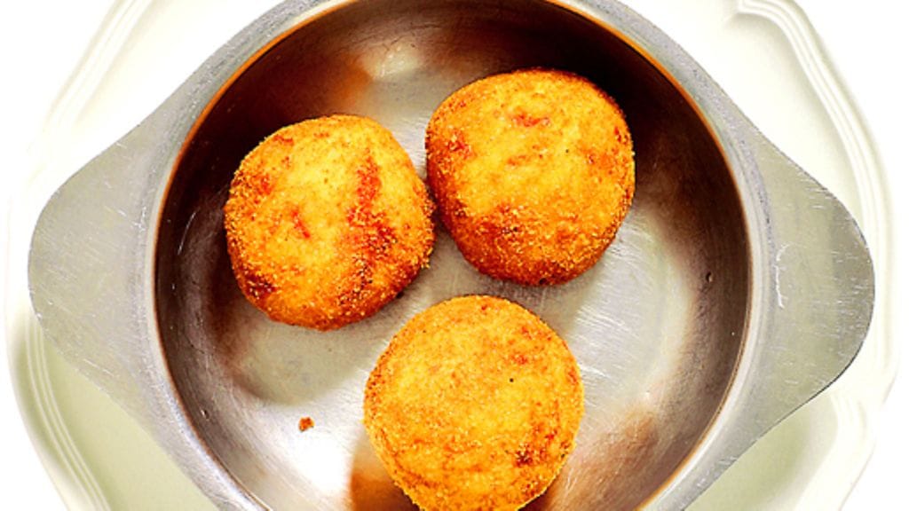 3. Lämmitä friteerausöljy 160 asteeseen. Friteeraa riisipallot muutama kerrallaan ja nosta ne sitten valumaan talouspaperin päälle.