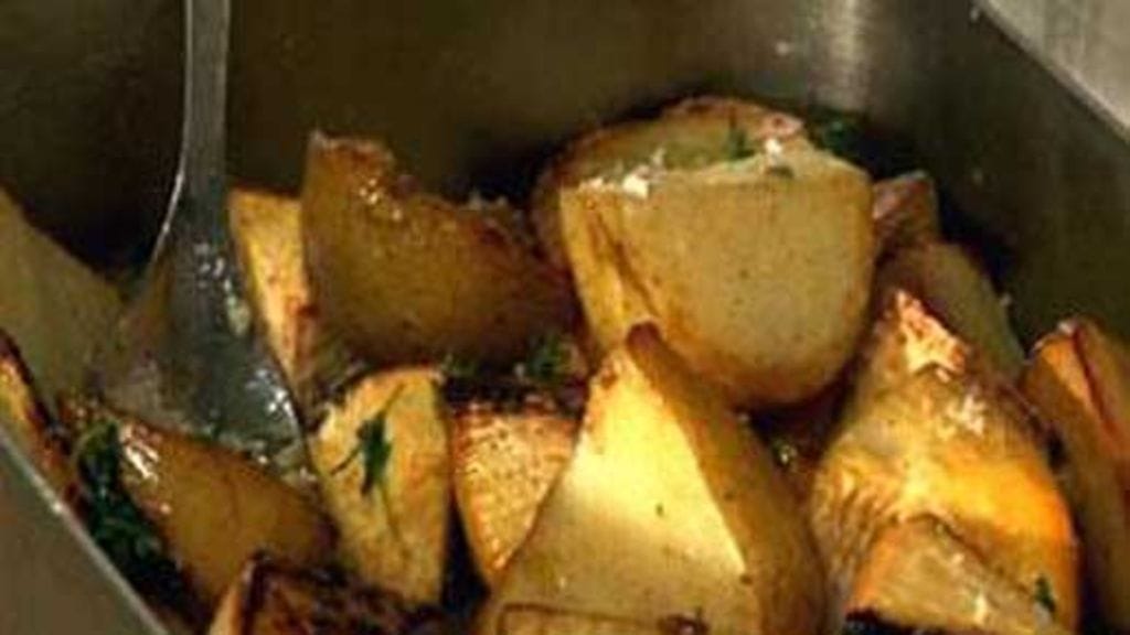 Pese juurekset ja leikkaa isoiksi lohkoiksi. Laita voideltuun uunivuokaan ja paista 175°c:ssa n. ½ tuntia tai kunnes ovat kypsiä. Sulata voi ja revi sekaan timjamin lehtiä. Purista voin sekaan sitruunamehu. Pyöräytä voi juureksien sekaan ennen tarjoilua ja mausta suolalla.
