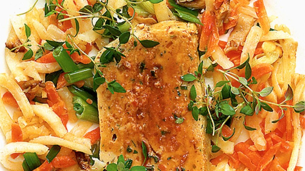 3. Puhdista, kuori ja suikaloi perunat, porkkana, juuriselleri, palsternakka ja purjo. Puhdista ja viipaloi sienet ja kuullota niitä voissa tai öljyssä paistinpannulla. Kuullota myös perunat ja juuressuikaleet. Leikkaa murekkeesta ohuita siivuja ja tarjoa juuressuikaleiden ja sienten kera. Koristele tuoreella timjamilla tai muulla yrttimausteella.