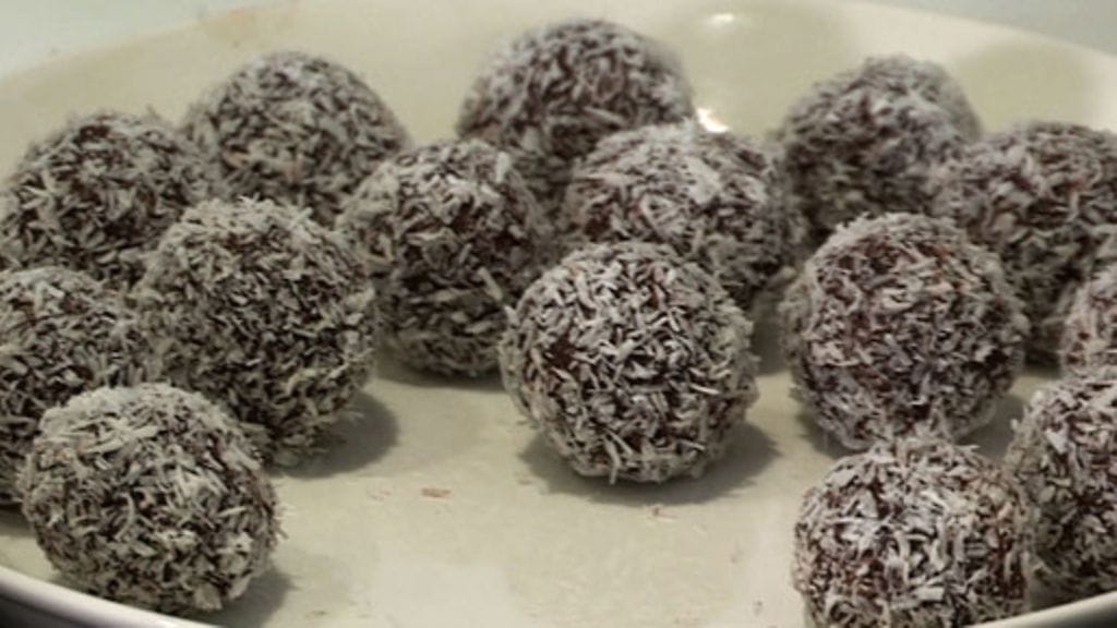 * Pyörittele taikinasta palloja ja kierittele ne kookosrouheessa.