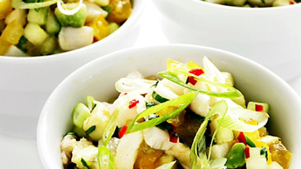 1. Purista sitruunasta ja limestä mehu. Kuutioi kampasimpukat ja ruijanpallas. Kuori ja raasta valkosipulinkynsi hienoksi, sekoita lime- ja sitruunamehun kanssa ja marinoi simpukoita ja kalaa n. 40 minuuttia.