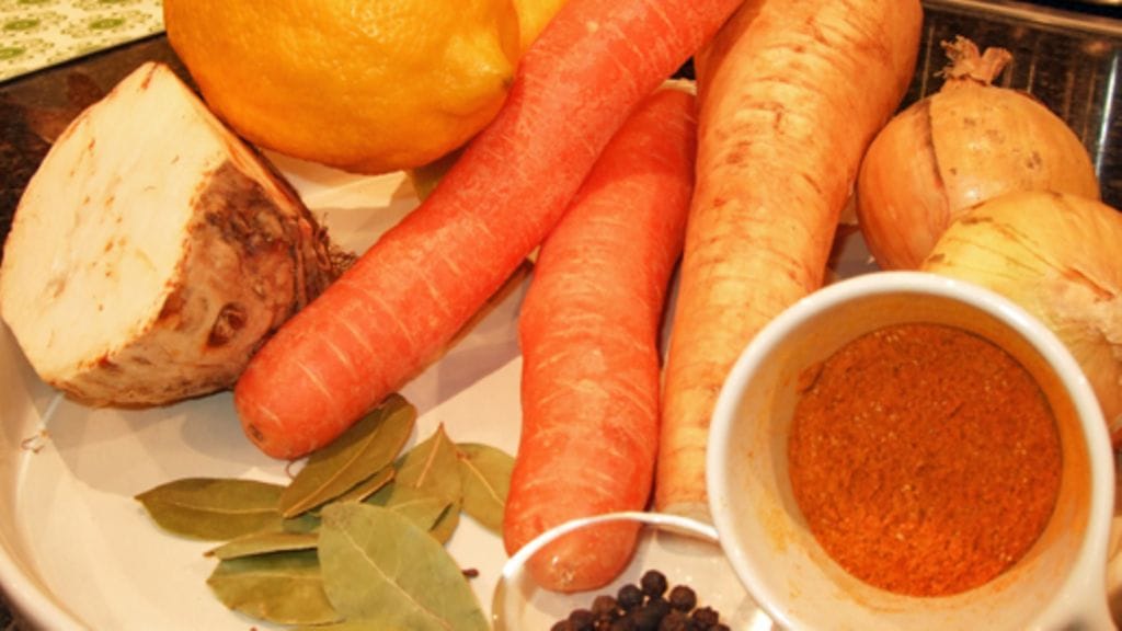 Lisää pestyt, paloitellut juurekset ja sitruunanpuolikas. Mausta pippureilla ja laakerinlehdillä. Täytä kattila kylmällä vedellä niin, että ainekset peittyvät.