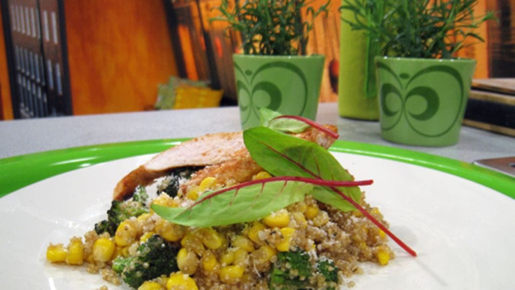 Quinon kypsyyden näkee siementen vaalentuessa ulkoreunasta kohti keskustaa. Sekoita sulanut maissi sekä parmesaanijuusto joukkoon ja anna jäähtyä huoneenlämpöiseksi.