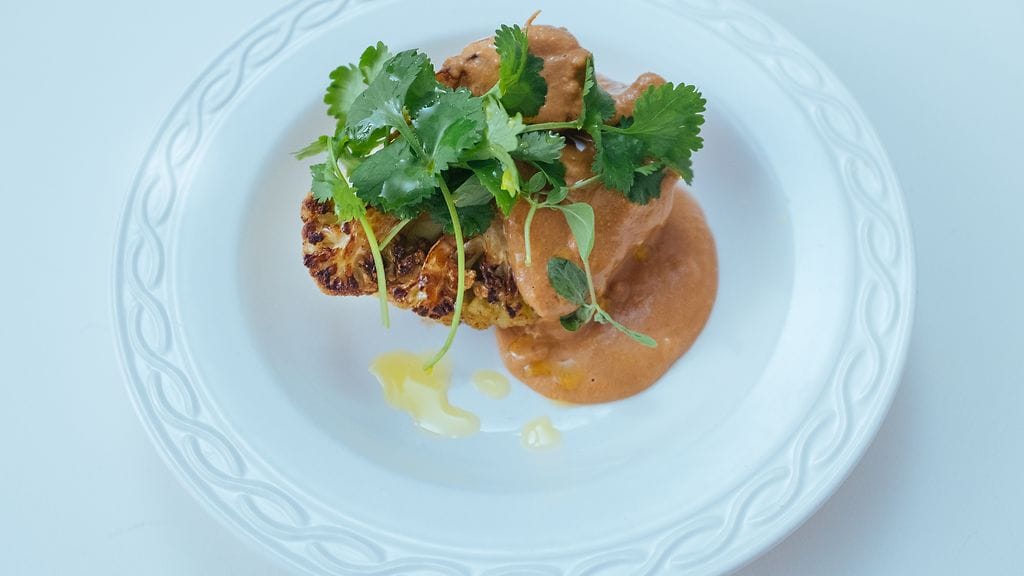 Rapeaa kukkakaalia, kukkakaalipyreetä ja satay-kastiketta: