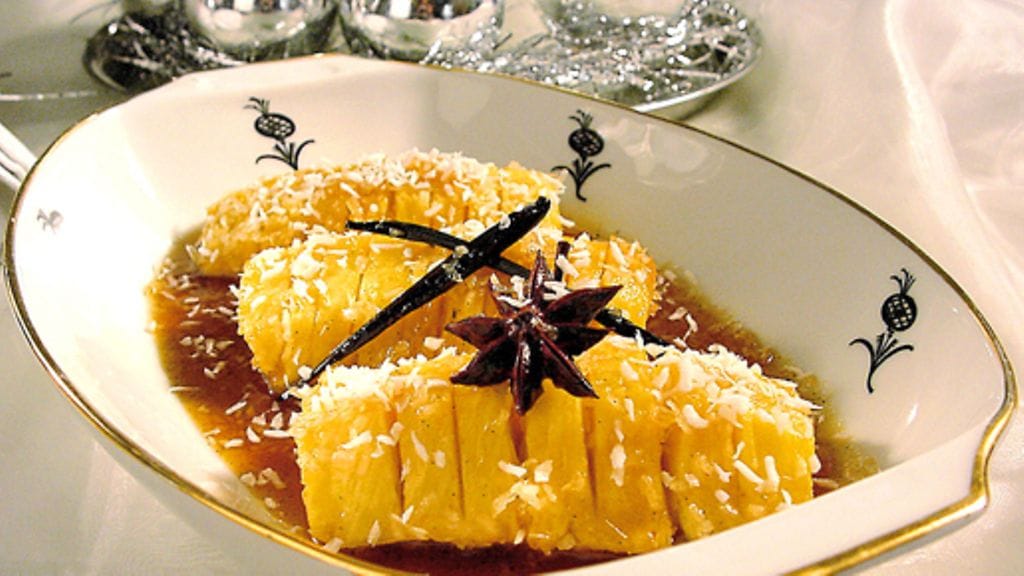 4. Laita ananasveneet jälkiruokakulhoihin, lusikoi liemi päälle ja viimeistele vaniljajäätelöllä.