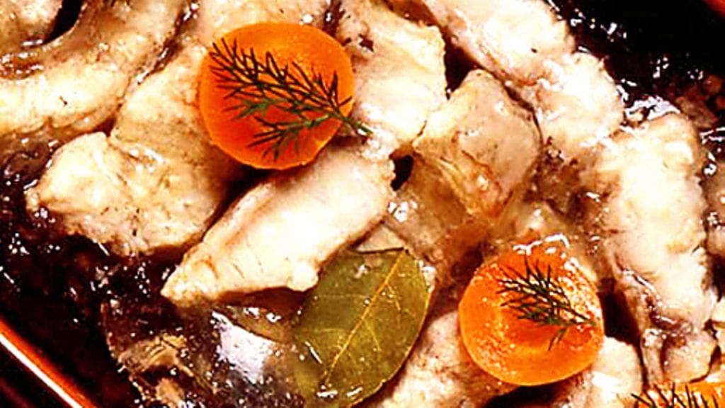 2. Sekoita etikka ja vesi liemeen ja lisää suola, valkopippurit, porkkana, sipuli ja maustekimppu. Tarvitset niin paljon lientä, että se juuri peittää kalan. Kuumenna liemi kiehuvaksi ja maista, mausta lisää tarvittaessa. Lisää kala, kuumenna kiehuvaksi. Kuori vaahto. Anna kiehua hiljalleen 10 minuuttia. Lisää sitruunamehu ja anna kiehua n. 15-20 minuuttia, kuori välillä vaahtoa. Laita liivatelehti likoamaan kylmään vesitilkkaan.