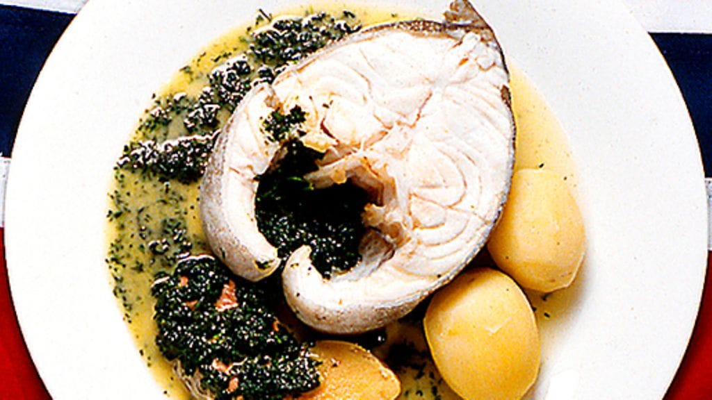 2. Leikkaa turskan paksuimmasta kohdasta 4 kyljystä, noin 3 sentin paksuisia. Keitä vesi isossa kattilassa ja lisää 3 rkl suolaa. Laita turska kiehuvaan veteen. Ota kattila pois liedeltä, 7 minuutin kuluttua turska on kypsä. Tarkista, että kala on valkoinen ja läpinäkymätön kauttaaltaan, ellei, kiehauta se vielä.