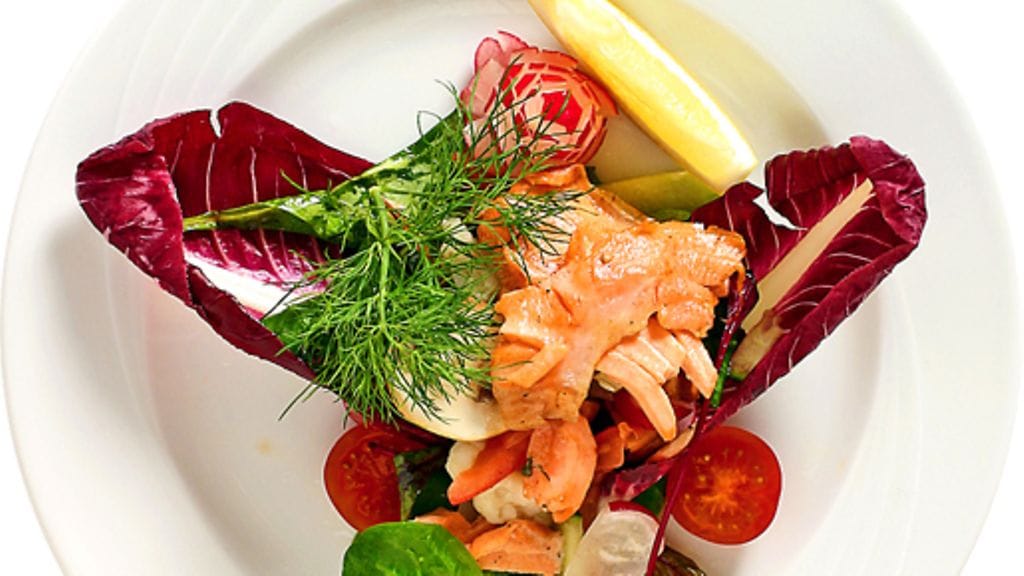 3. Sekoita kasvikset ja ripottele päälle kastike. Ruskista lohiviipaleita hetki kuumalla pannulla. Asettele viipaleet päällimmäiseksi. Koristele tillillä ja sitruunalla.
