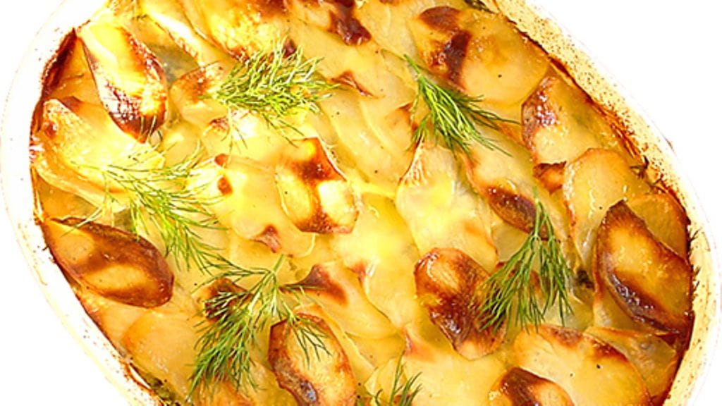 3. Vatkaa munat, maito ja mustapippuri ja kaada vanukkaan päälle. Paista uunin alatasolla 50-60 minuuttia kunnes perunat ovat pehmenneet. Jos vanukas näyttää kuivalta paistamisen aikana, lisää maitoa. Keitä vesi ja kalafondi. Mausta tillillä ja purjolla ja tarjoile lohen kera.