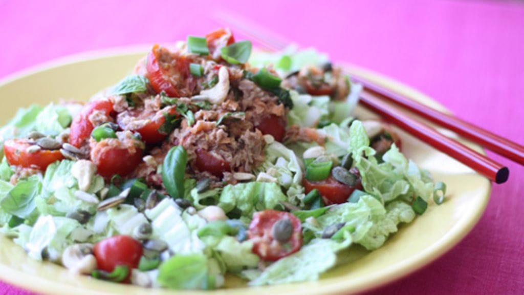 Sekoita porkkana, tomaatit ja tonnikala keskenään.