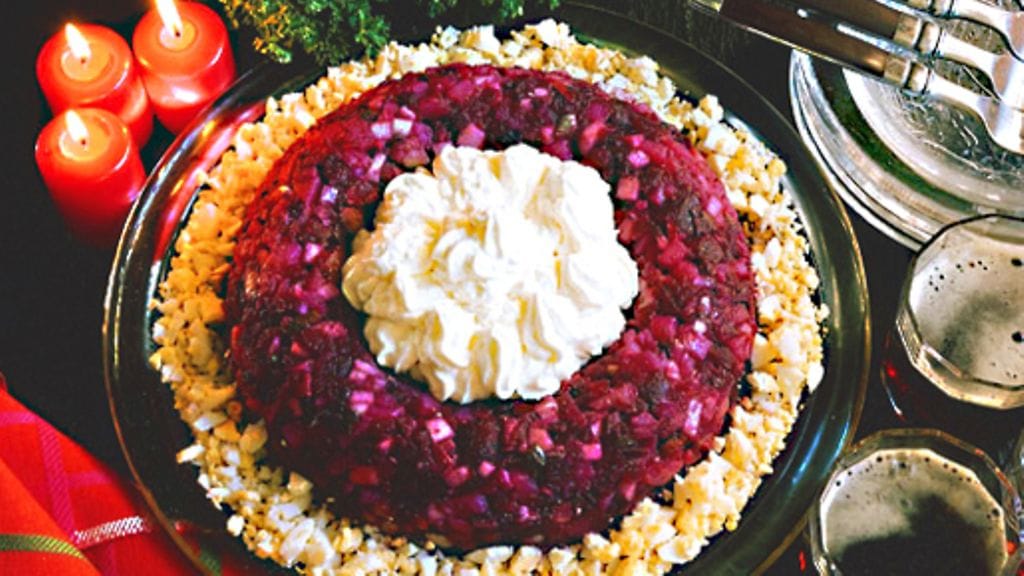 3. Kumoa rosolli vadille, koristele hienonnetulla kananmunalla ja vatkatulla kermalla.