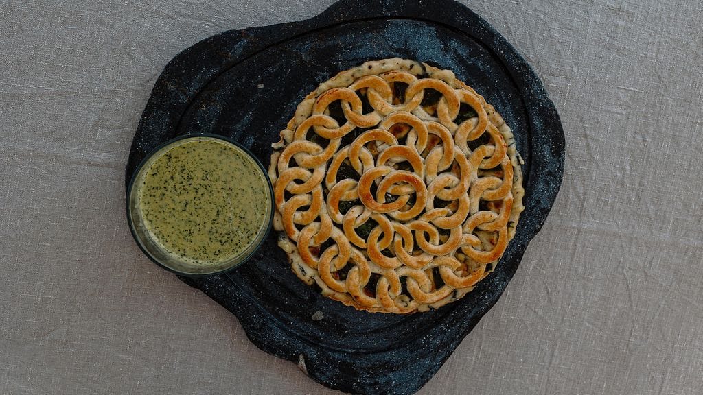 Leikkaa sopiva pala piirakkavuokaan (halkaisija noin 20 cm) ja säästä loput piirakan kantta ja koristelua varten. Jäähdytä noin 15min. Pistele taikinan pohjaa haarukalla. Peitä pohja leivinpaperilla ja kaada herneet vuoan pohjalle painoksi. Esipaista 15-20min.