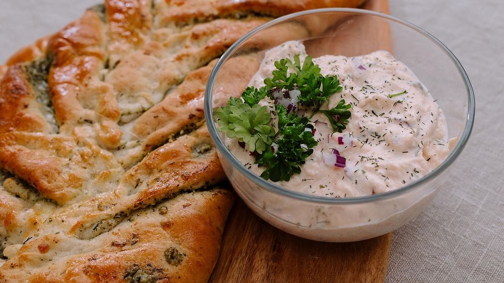 LEIPÄTAIKINA: Sekoita kuivahiiva 42 asteiseen maitoon. Lisää sokeri ja suola. Sekoita jauhot desi kerrallaan, aloita lisäämällä ensin ohrajauho ja sitten vehnäjauhoja 5dl (tai sen verran, että taikina tuntuu sopivalta). Lisää pehmeä voi jauhojen lisäyksen loppuvaiheessa. Vaivaa taikinaa hyvin (10min). Anna taikinan levähtää n. 10 min. Valmista sillä aikaa tillipesto.