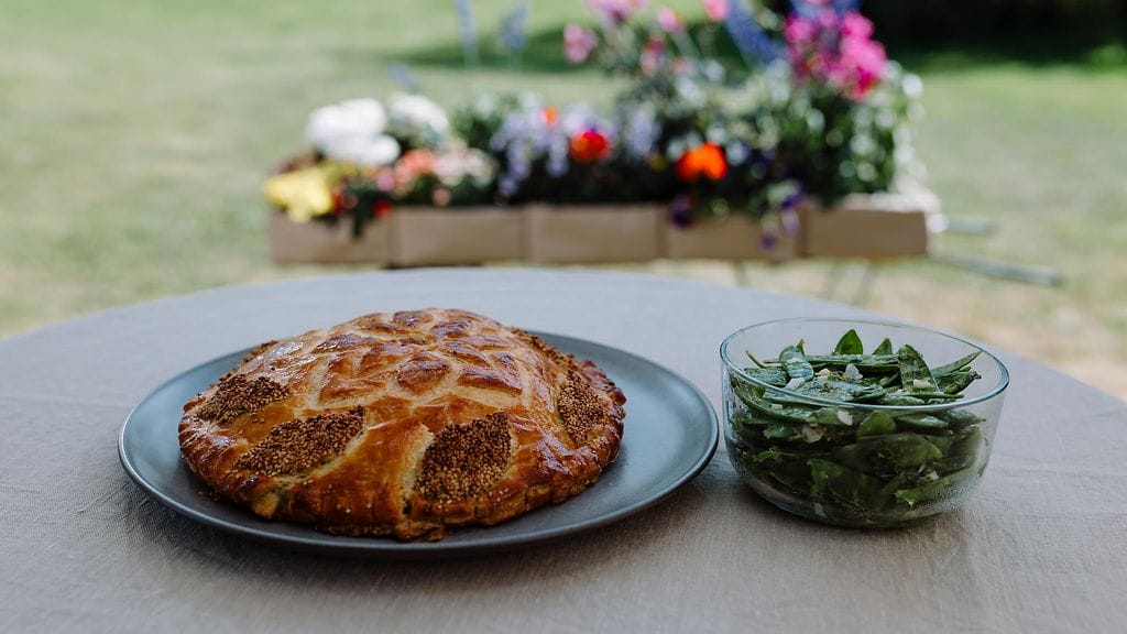 TÄYTTÄMINEN: Jaa taikina kahteen osaan siten, että toinen osa on hieman toista suurempi. Kaulaa pienempi taikina halkaisijaltaan 24 cm ja suurempi taikina 27 cm suuruiseksi ympyräksi. Leikkaa ympyrät tasaisiksi käyttäen apuna pahvimalleja. Laita pienempi ympyrä pellille leivinpaperin päälle. Kumoa täytteet pienemmän ympyrän keskelle. Nosta suurempi ympyrä kanneksi. Sivele valkuaista alemman ympyrän reunoille ja paina reunat yhteen hellästi. Leikkaa reunoihin koristeviiltoja saksilla. Tee ylijäämätaikinasta ohuita lehdenmuotoisia koristeita taikinan päälle. Sivele niihin valkuaista ja dippaa ne seesaminsiemenissä. Voitele kansi vesitilkalla ohennetulla keltuaisella. Tee keskelle kantta ristiviillot, jotta höyry pääsee poistumaan paiston aikana. Viillä kanteen kuvioita leipurinterällä, mutta varo, ettet läpäise taikinaa kokonaan. Asettele koristeet kannen päälle. Paista piirasta 220 asteessa n. 30 minuuttia.