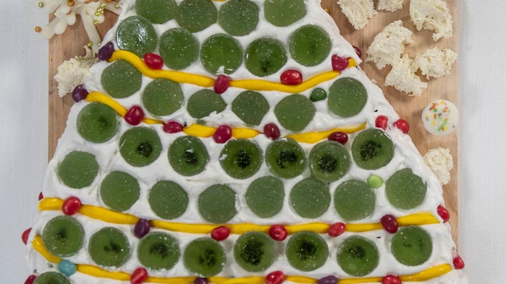 Jäähdytä kakkulevy. Leikkaa kakkupohja kuusen muotoon. Valmista kuorrutus vaahdottamalla kauravispi. Makeuta tomusokerilla ja glögillä. Voit kostuttaa pohjaa glögillä. Levitä kuorrutus kakkulevylle. Koristele.