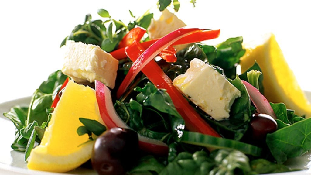 2. Pirskottele salaatin päälle hyvälaatuista oliiviöljyä ja viinietikkaa. Lisää mausteeksi ripaus suolaa (fetajuusto on melko suolaista) ja runsaasti vastajauhettua mustapippuria. Koristele sitruunalohkoilla.
