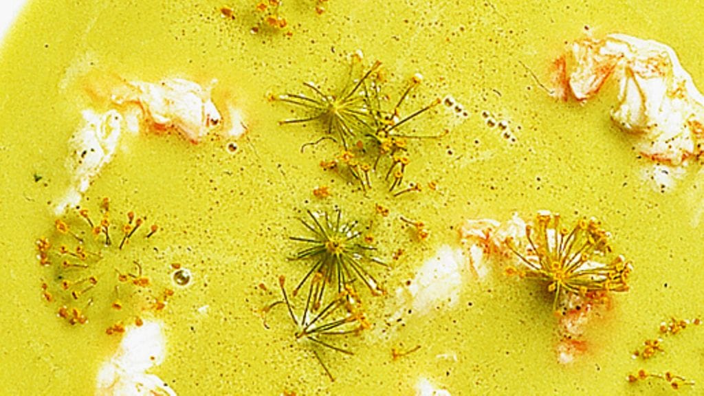 3. Jaa lämpimät ravunpyrstöt lämmitetyille lautasille, kaada keitto päälle ja koristele pienillä tillinkruunuilla. Tarjoile heti.
