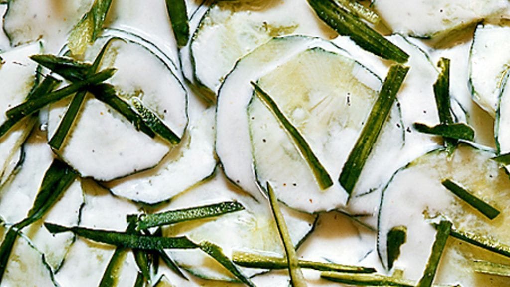 1. Viipaloi kurkku ohuesti, mielellään juustohöylällä, ja laita viipaleet vadille. Mausta jogurtti valkosipulilla, sitruunamehulla, suolalla ja pippurilla.