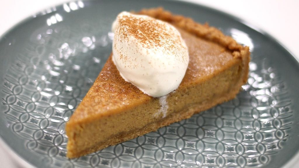 Vaahdota kerma ja mausta se sokerilla ja kanelilla. Tarjoile kurpitsapiirakka kanelikermavaahdon kera.
