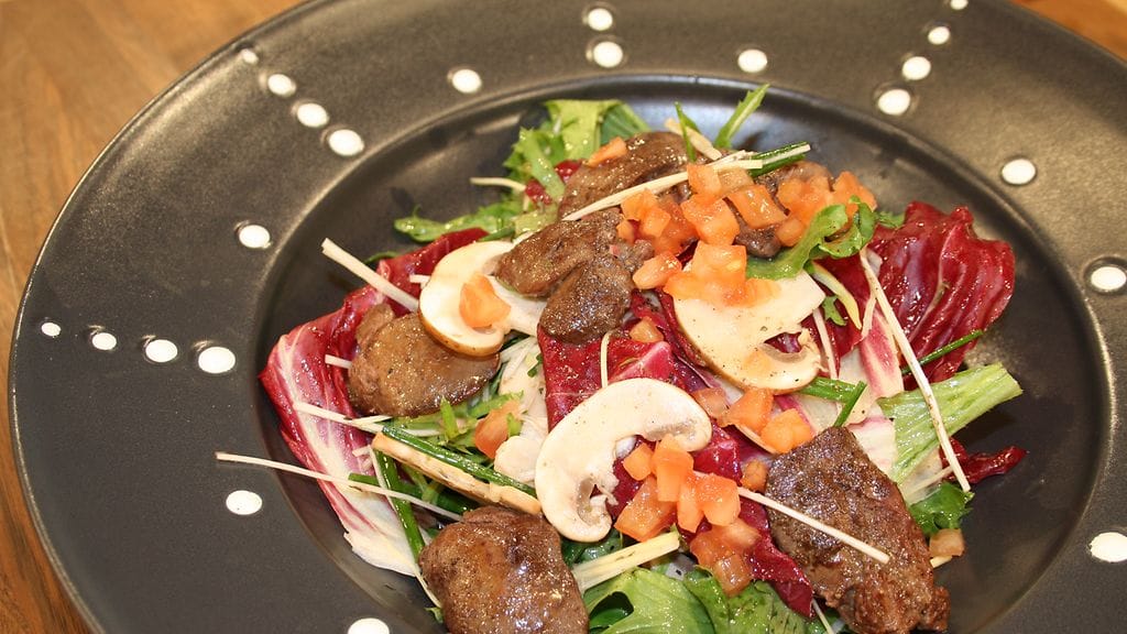 4. Nosta broilerinmaksa salaattipedille ja ripottele päälle omenasuikaleet. Tarjoa ennen kuin maksa ehtii jäähtyä.