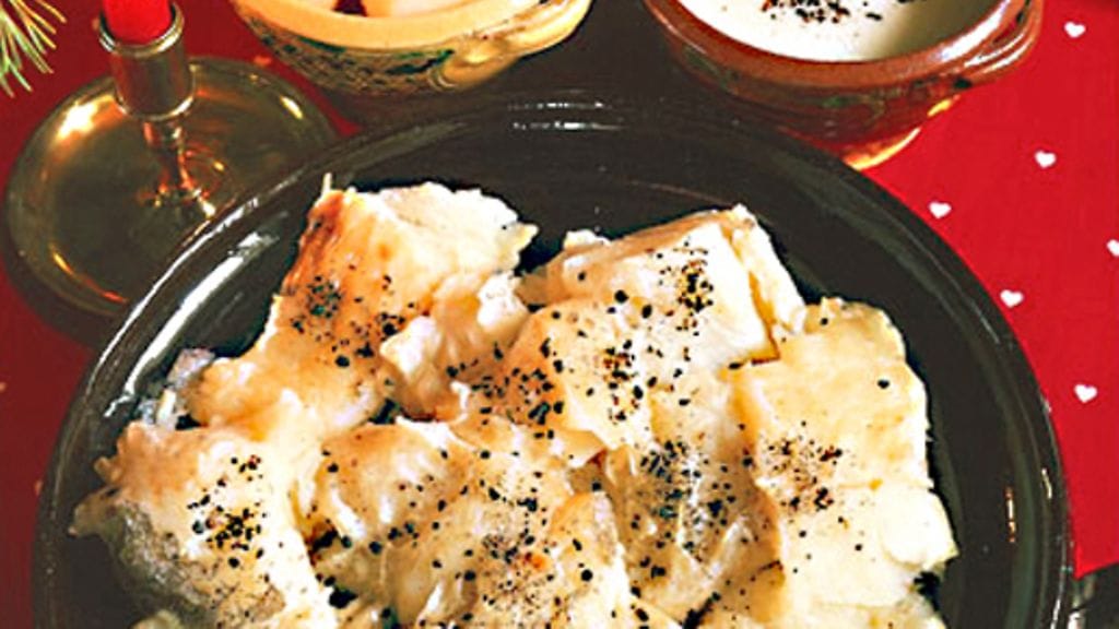 3. Paista margariini ja jauhot kastikkeeseen pienessä kattilassa, lisää maitoa vähän kerrallaan samalla sekoittaen. Anna kastikkeen kiehua miedolla lämmöllä 10 minuuttia, mausta suolalla ja ripauksella pippuria.