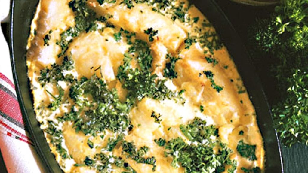 Tässä laatikossa keitetty lipeäkala on pääosassa. Pehmeä munamaito antaa ruoalle mieluisan maun. Tarjoile keitettyjen perunoiden kera.