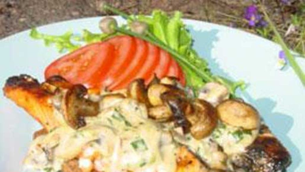 Kuumenna grilli erittäin kuumaksi ja grillaa kalapalat siinä molemmin puolin. Lämmitä myös leipäviipaleita, mutta älä liikaa, etteivät ne pala. Revi salaattia ja sipulin vihreitä osia lautaselle ja leikkaa tomaattiviipaleita mukaan. Kokoa sitten annos niin, että alle tulee leipää, sitten lohta, kastiketta ja muutama jälkeenpäin grillattu sieni koristeeksi.