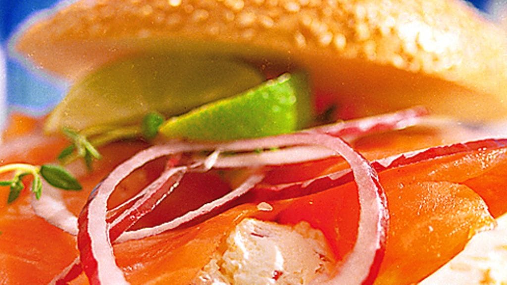 1. Kuori punasipuli ja leikkaa siitä muutama kaunis rengas. Laita sivuun koristelua varten. Hienonna loppu sipuli pieneksi. Sekoita sipulisilppu tuorejuustoon. Halkaise bagelit kahtia. Levitä juustoseosta rinkeleiden alaosille.
