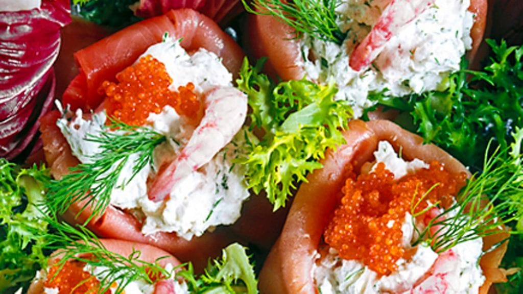 3. Liitä yhteen aina kaksi lohiviipaletta ja kierrä ne rullalle. Peitä vati salaatinlehdillä ja nosta lohirullat salaattipedille. Täytä kierteet katkarapukermalla ja koristele mädillä, katkaravuilla ja tillillä.