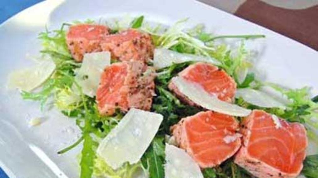 Leikkaa terävällä veitsellä pötköistä sopivia lohipastramipaloja. Poista paloista kelmut vasta leikkaamisen jälkeen. Tarjoile salaatin kera.