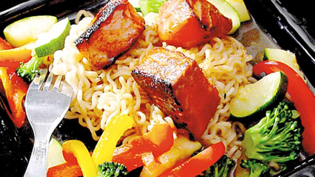 4. Tarjoile nuudelit ja vihannekset kulhoista. Mausta suolalla, pippurilla, sweet chilillä, soijalla ja seesamiöljyllä. Asettele lohta annosten päälle.