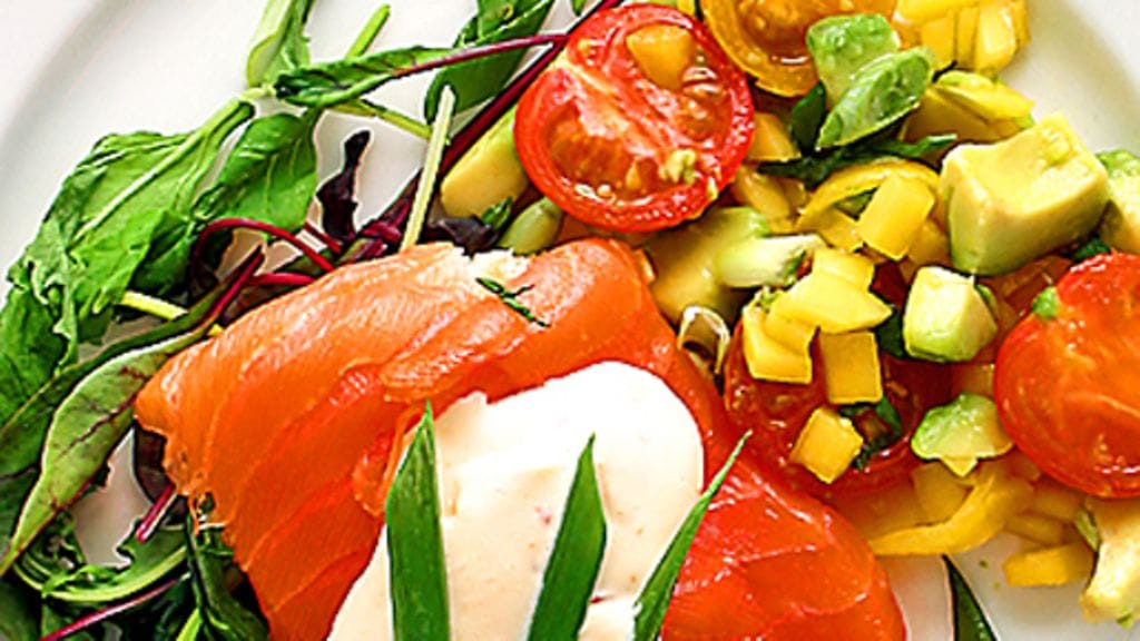 2. Jaa salaatti neljälle lautaselle tai isolle vadille. Asettele lohta salaatin päälle ja laita nokare tuorejuustoa lohen päälle.