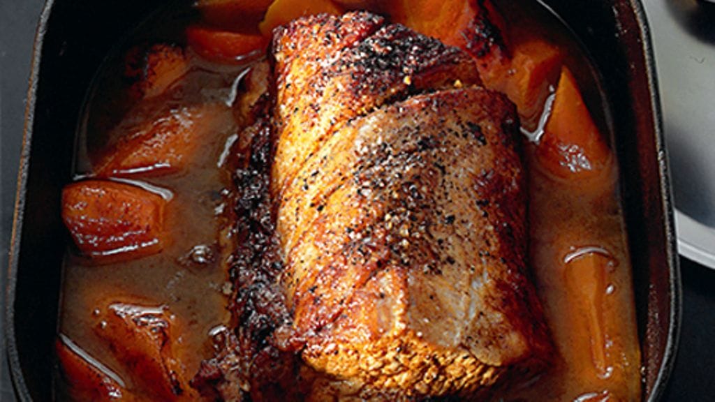 2. Siirrä liha pataan ja työnnä lihan paksuimpaan kohtaan lämpömittari. Kaada pataan lihaliemi, kuumenna kiehuvaksi ja anna poreilla miedolla lämmöllä, kunnes mittari näyttää 80 astetta, siihen menee noin 1 ½ tuntia. Pane porkkanapalat pataan viimeisten 10 minuutin ajaksi. Nosta kypsä liha padasta ja anna sen levätä alumiinifoliossa 20 minuuttia.