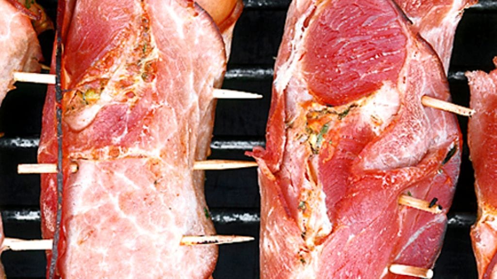 3. Kääri makkarat kinkkuviipaleiden sisään, kiinnitä hammastikuilla. Paista välillä käännellen grillillä n. 15 minuuttia.