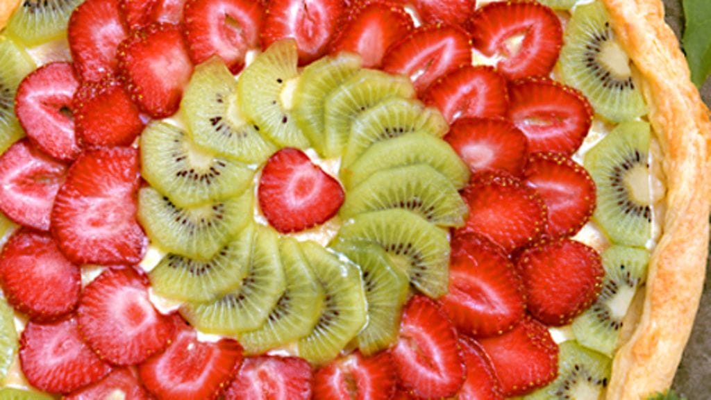 8. Levitä mantelimassa piiraskuorelle ja peitä vaniljakreemillä. Asettele kiiviviipaleet ja mansikkaviipaleet kauniiksi kuvioksi kreemin päälle.