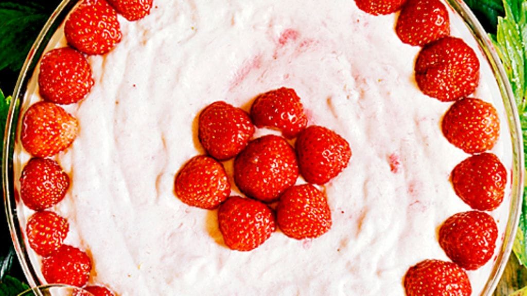 3. Kaada hyydyke vuokaan, peitä muovikelmulla ja laita jääkaappiin. Koristele mansikoilla, kun hyydyke on hyytynyt.