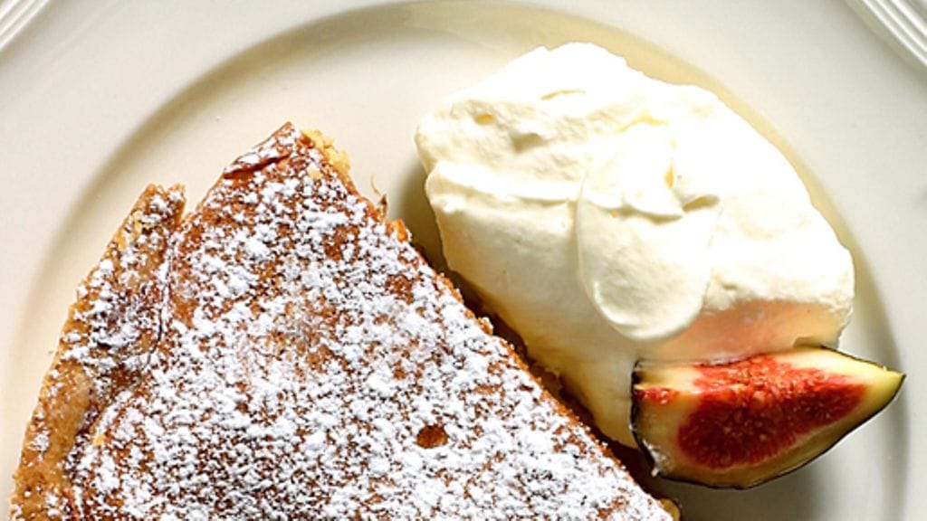 3. Levitä piirakkapohjalle 2 ruokalusikallista aprikoosihilloa, levitä hillon päälle täyte ja täytteen päälle luumut nesteineen. Paista 30-35 minuuttia, kunnes piirakka on väriltään kullankeltainen. Anna jäähtyä. Kuumenna loppu hillo ja armanjakki ja keitä kokoon siirapiksi. Levitä piirakan pinnalle.
